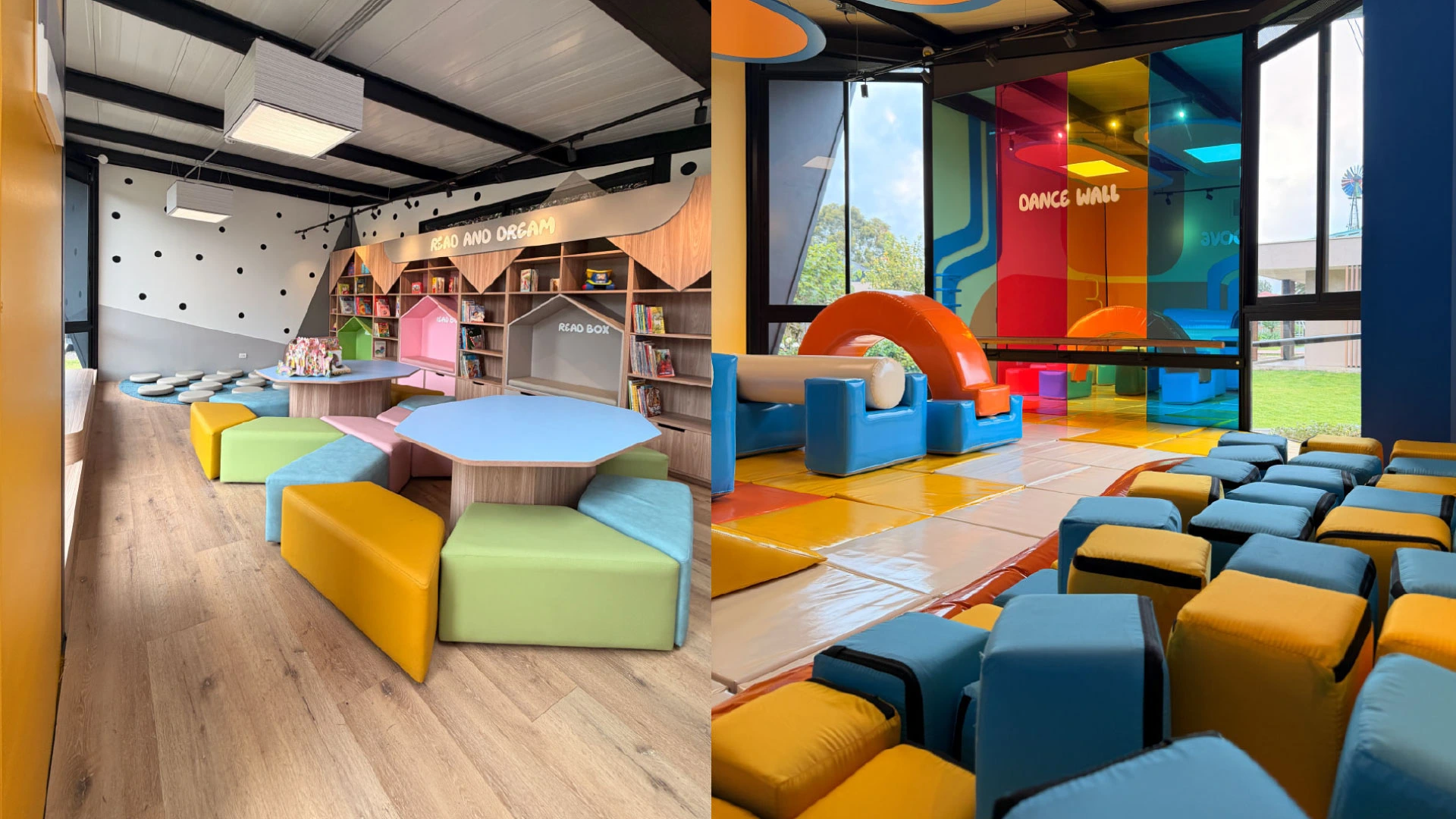 Biblioteca (“Read and Dream”): Un área con zonas especializadas para la lectura individual y graderías para el diálogo grupal, fortaleciendo la conexión afectiva con los libros.